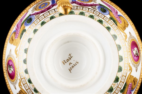 Nast manufacture, Paris, early 19th century. Polychrome porcelain gilt-rimmed mug painted with winged horses. Handle decorated at the attachment with classical mask and acanthus leaves (h. cm 8; d. cm 12) (minor defects)
