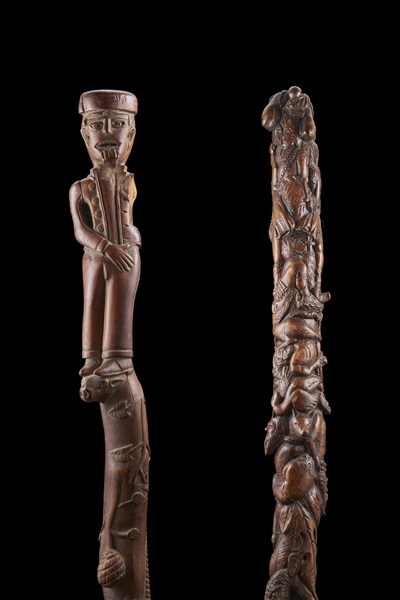 Lot comprising two carved wooden walking sticks decorated with anthropomorphic figures and other scenes (defects and losses)