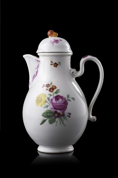 Vienna manufacture, late 18th century. Polychrome porcelain coffeepot in with flowers and leaves. Marked at base with numeral 136 (h. cm 18) (minor defects)