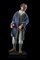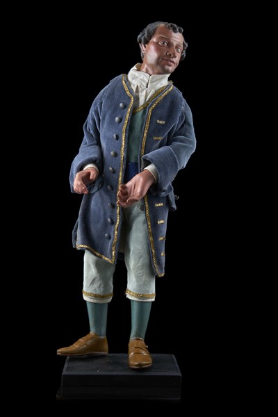 Arte dell'Italia meridionale, fine del secolo XIX. Scultura da presepe in legno intagliato raffigurante personaggio popolare con giacca blu, abiti in tessuto e seta con applicazioni in metallo dorato (h. cm 40) poggiante su base squadrata (lievi difetti)