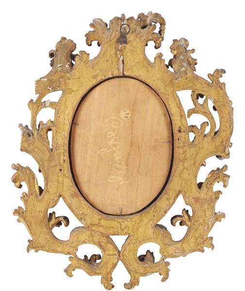 In cornice in legno intagliato e dorato a volute (difetti, restauri e mancanze)