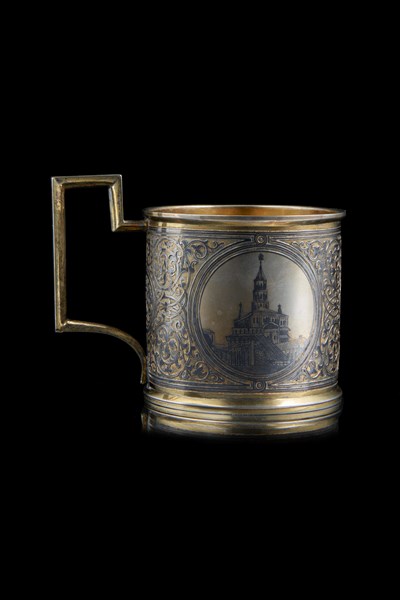 Porta bicchiere in argento e vermeille inciso e niellato a volute e medaglioni con chiesa ed arco e cifre coronate. Recante punzoni di San Pietroburgo, 1893 (h. cm 7) (g 170) (difetti)