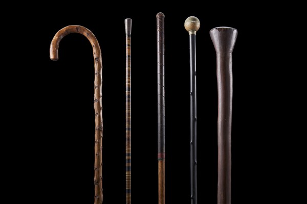 Lotto composto da una mazza africana e quattro bastoni in legno e altri materiali, epoche e misure diverse (difetti)