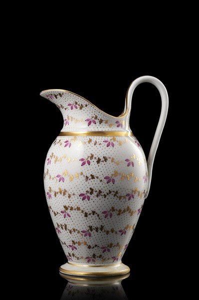 Manifattura francese, secolo XIX. Versatoio in porcellana bianca dipinta nei to