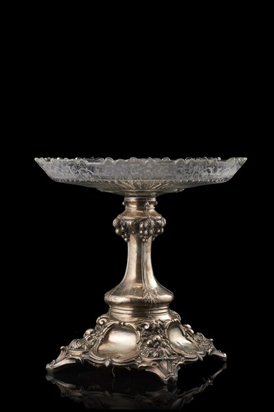 Alzata centrotavola con coppa in vetro decorata all'acido a elementi stilizzati. Base in lamina d'argento sbalzata e cesellata a frutta e foglie d'acanto. Secolo XIX. Apparentemente priva di punzoni (d. cm 31; h. cm 31)