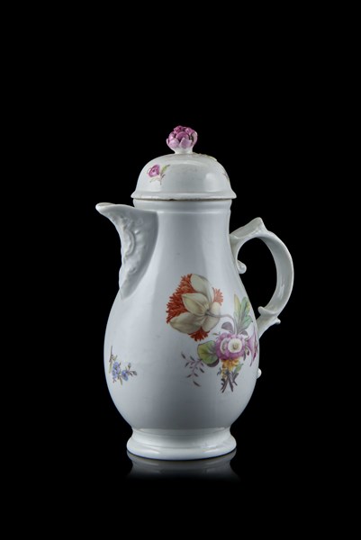 Frankenthal manufacture, late 18th century. Small porcelain coffee pot. Flower-shaped lid socket in the round, marked at base (h. cm 17) (defects, lid glued on)