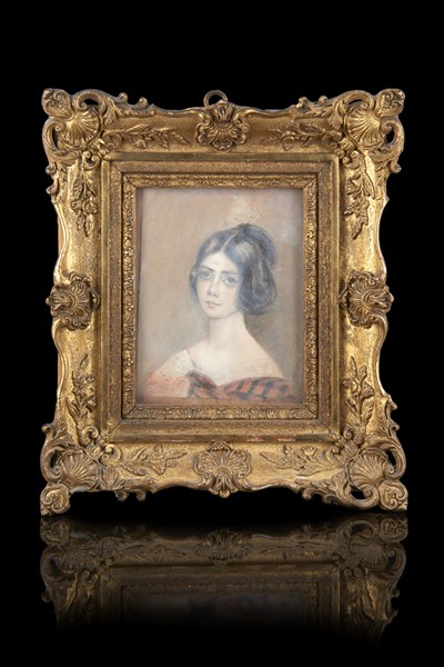 Artista del secolo XIX "Marchesa Costanza Scati nata Grimaldi" tecnica mista su carta (cm 9,5x12 ca.) In cornice in legno intagliato e dorato a volute, foglie, fiori e valve di conchiglia (difetti)