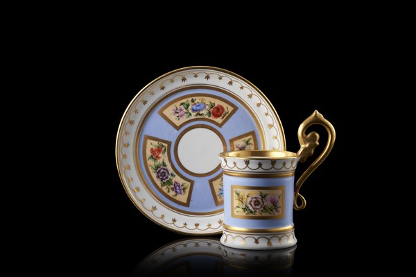 Manifattura francese, secolo XIX. Tazza con piatto in porcellana dipinta in policromia e dorature con riserve a mazzi di fiori (tazza: h. cm 14; piatto: d. cm 18) (difetti e restauri, rotture al manico)