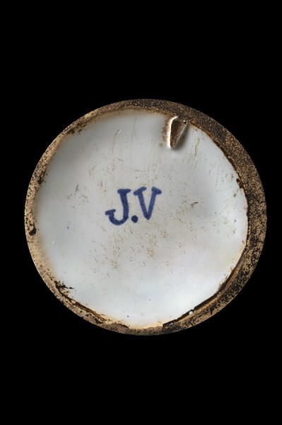 Delft manufacture, 18th-19th century. Pair of small majolica potiches with lids decorated with flowers. Marked J.V. at base (h. cm 18) On carved and gilded wooden bases (defects)