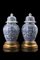 Manifattura di Delft, secolo XVIII-XIX. Coppia di piccole potiche con coperchio in maiolica decorata nei toni del blu a volute e fiori. Marcate J.V. alla base (h. cm 18) Poggianti su basi in legno intagliato e dorato (difetti)