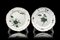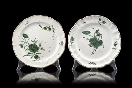 Manifattura di Lodi, secolo XVIII. Due piatti in maiolica con bordo mosso e profilato a fondo bianco decorata nella falda e nel cavetto a fiori nei toni del verde. Uno con marca "chiodo" al retro (d. cm 23,5) (difetti)