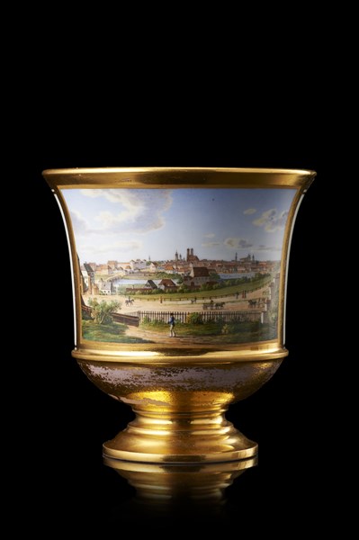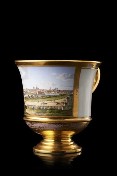 19th-century manufacture. Polychrome porcelain gilt-rimmed mug with view of Munich. Titled at base (h. cm 10) (defects)