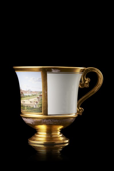 Manifattura del secolo XIX. Tazza a bordo dorato in porcellana con riserva poli