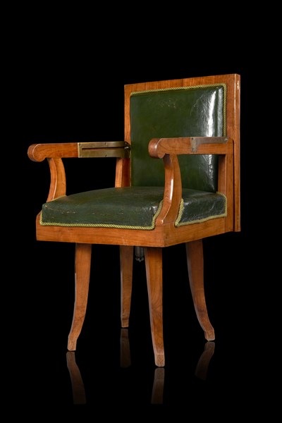Poltrona da campo girevole in ciliegio, con schienale ribaltabile a scrittoio, applicazioni in ottone, braccioli a ricciolo, gambe a sciabola. Seduta e schienale rivestiti in cuoio verde. Secolo XIX (difetti)