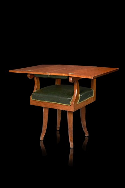 Poltrona da campo girevole in ciliegio, con schienale ribaltabile a scrittoio,
