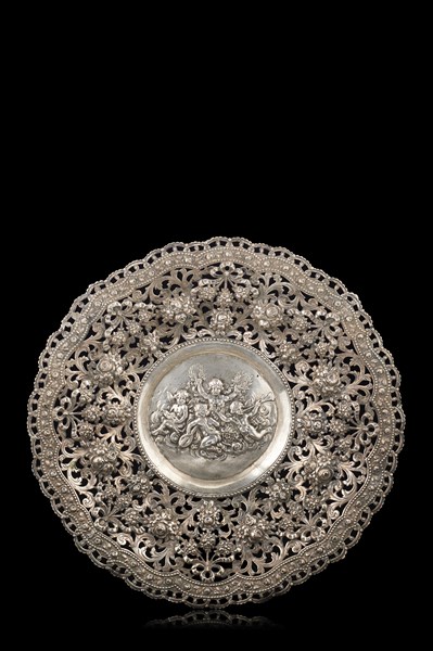 Centrotavola in argento sbalzato e cesellato con tesa decorata da fiori e volut