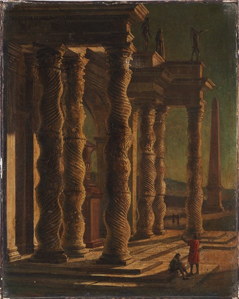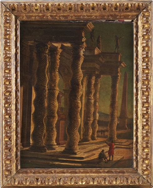 Scuola romana del secolo XVIII Capriccio con figure Olio su tela, cm 47x38,5 I