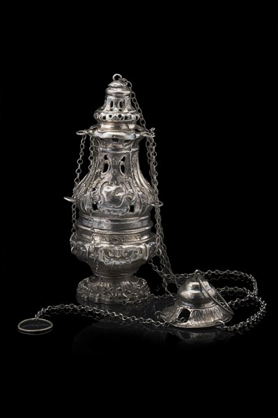 Turibolo in argento cesellato e decorato a foglie d'acanto e traforato. Cartell