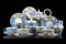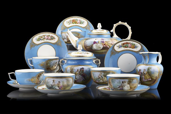 Manifattura di Sèvres, secolo XIX. Parti di servizi da tè di simil decoro in porcellana a fondo azzurro decorata in policromia a scene galanti e fiori entro cornici dorate. Composto da teiera, zuccheriera, lattiera e sei tazze con piattino. Marcato, numerato e incusso alla base (lievi difetti)