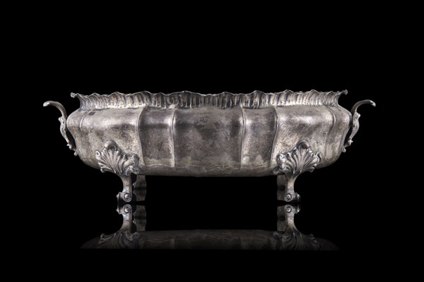 Centrotavola biansato in argento a quattro piedini mossi terminanti a riccioli. Titolo 800 (L. cm 46) (g 1700) (difetti)
