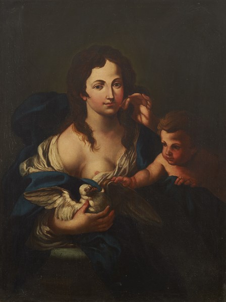 Scuola emiliana del secolo XVIII Venere amore e colomba Olio su tela, cm 98x73