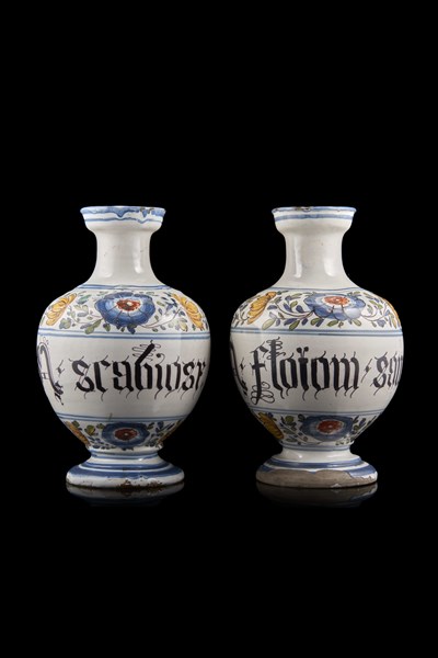Emilian manufacture, late 18th century. Pair of majolica pharmaceutical bottles for the preservation of medicinal herbs inscribed "Floiom Sambucci" and "Scabiose" (h. cm 25) (defects, losses and falls to the enamel)