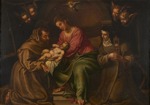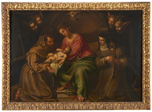 Scuola del secolo XVIII Madonna con Bambino tra i santi Francesco e Chiara Olio