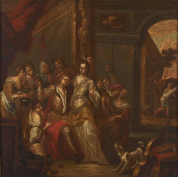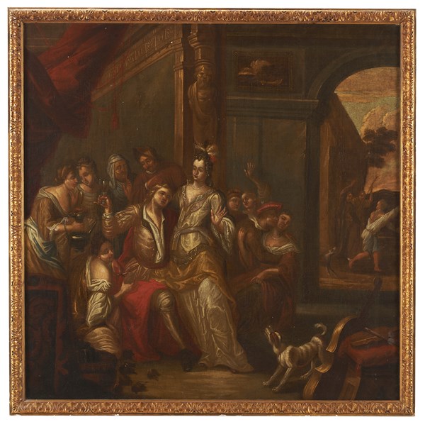 Scuola olandese del secolo XVIII Scena conviviale Olio su tela, cm 83x84 In co