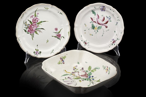 Lodi manufacture, 18th century. Two polychrome majolica plates and a bowl decorated with flowers and leaves. One plate and bowl with "nail" mark at base (plates d. max cm 23; bowl cm 26x6x23) (defects)