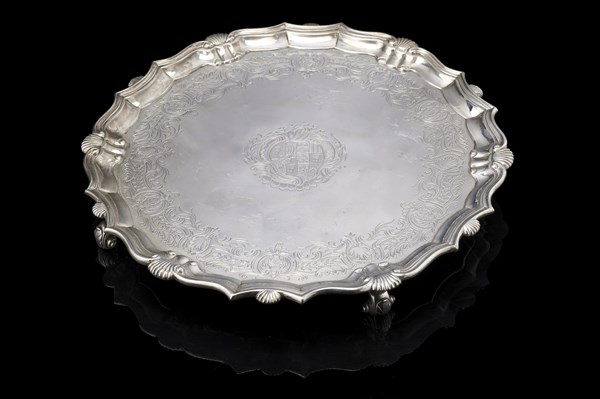 Salver in argento inciso nel cavetto da mascheroni e valve di conchiglia entro festoni e volute fogliate e al centro da stemma nobiliare. Bordo sagomato con valve di conchiglia in rilievo. Piedini a ricciolo. Punzoni di Londra, 1742. Argentiere John Tuite (d. cm 30,5) (g 880) (difetti)
