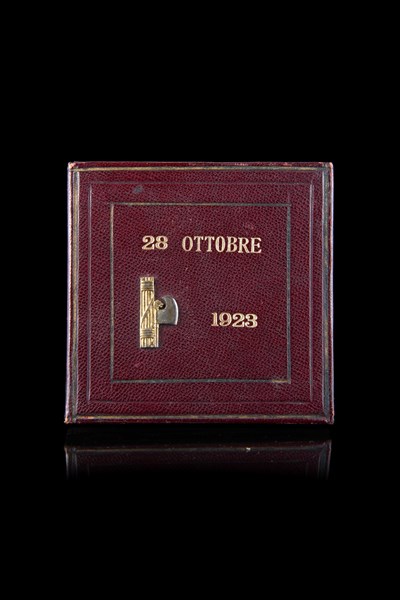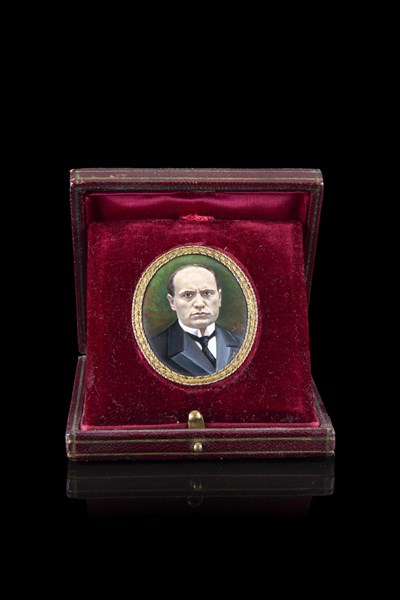 Ritratto di Benito Mussolini databile al 1923. Miniatura da viaggio ovale dipinta su porcellana dal miniaturista Italo De Bernardi, Milano. Firmata in basso a destra "Italo" in rosso. Contenuta in astuccio in legno e ricoperto di marocchino con impressa la data 28 ottobre 1923 ed un Fascio Littorio, primo tipo, in bronzo. Probabile dono a Benito Mussolini per l'anniversario della "Marcia su Roma"