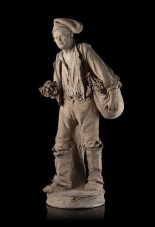 Giacomo Vaccaro (Caltagirone 1847-1931) "Venditore di verdure" figura in terracotta monocroma. Firma incussa alla base "G. Vaccaro" (h. cm 33) (difetti)