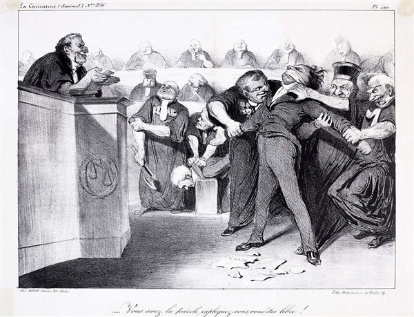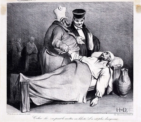 Pair of 19th century caricature lithographs, one by Daumier, different sizes (defects)