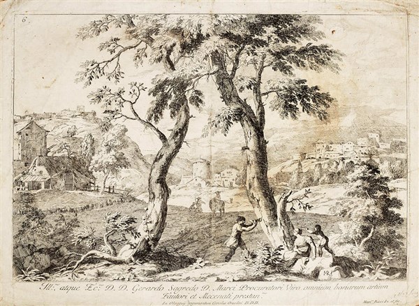 Marco Ricci "Paesaggio con città sullo sfondo e figure in primo piano", dalla serie dei Venti paesaggi, acquaforte (mm 334x456);