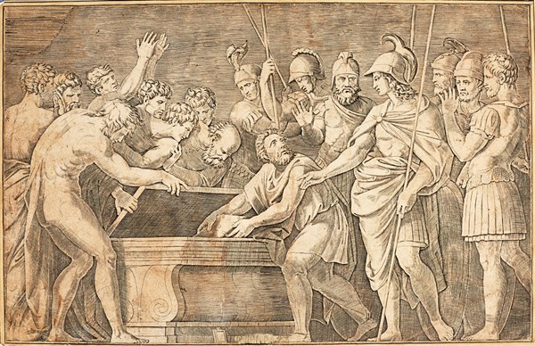 and a 16th century burin by an anonymous artist, pasted on cardboard depicting Alexander the Great and the Tomb of Achilles (256x399 mm)