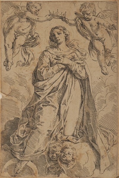 Simone cantarini Incoronazione della Vergineacquaforte incollata agli angoli su