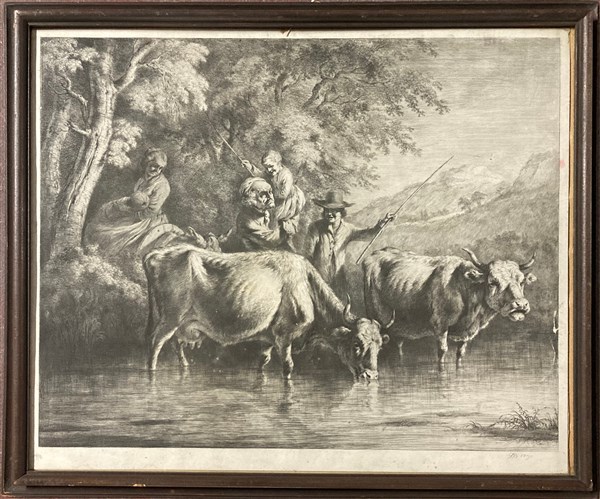 Ignoto della fine del secolo XVIII Famiglia di pastori con armenti all'abbever