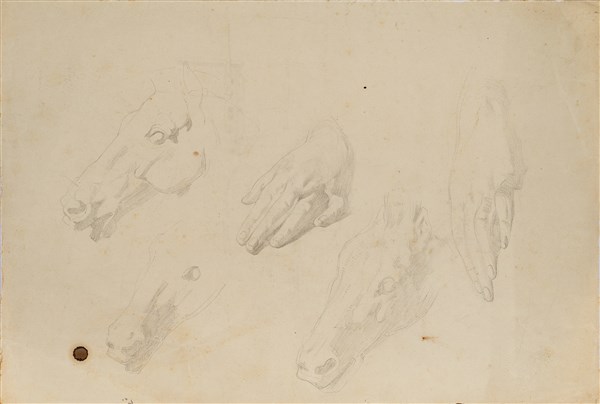 Giovanni Fattori, Studio di teste di cavallo, matita nera: al verso studio a penna, iscritto "Fattori", presente timbro a secco di Giovanni Malesci (mm 219x329);