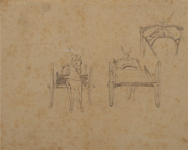 a black pencil drawing with Studies of a Cart with Donkey, attributed to Giovanni Fattori (mm 238x293)