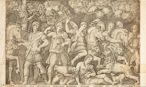 Lot 628 | Marcantonio Raimondi Caccia al leone bulino mm 260x446 incollato ai lati su supp