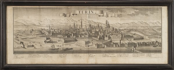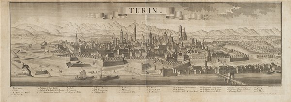 Valuable and impressive perspective view of the city of Turin seen from the river Po. Spires and bell-towers are highlighted. Characters and boats on the Po animate the scene. In the top centre within a wide band is the title. Legend along the lower side with 30 callouts on 10 columns.