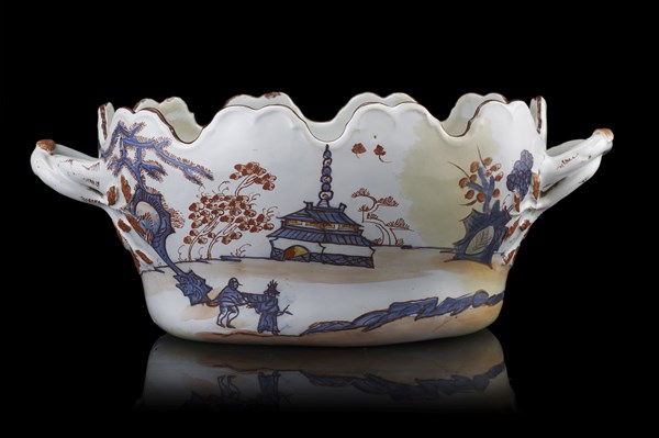 Manifattura Felice Clerici e Pasquale Rubati, Milano, secolo XVIII. Rinfrescatoio biansato a bordo mosso e profilato in rosso bruno in maiolica decorata "alla pagoda" o "al carabiniere". Anse a rami fogliati intrecciati (cm 31x12x19) (difetti e restauri)