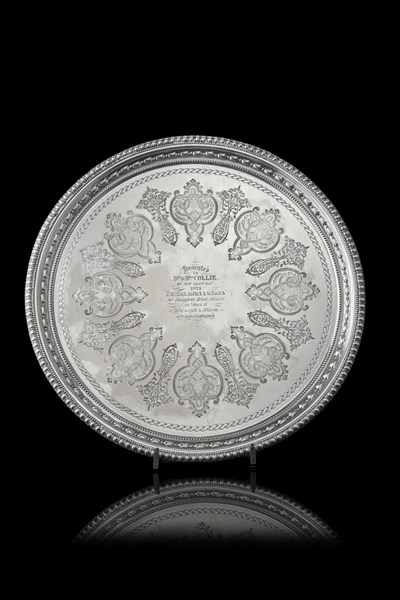 Salver in argento con bordo decorato a piccole bugnature e campanule, cavetto inciso a motivi stilizzati e iscritto "Presented to Dr & Mrs Collie, on new years day 1872 by officials nurses & servants of Homerton Fever Asylum in token of their respect & esteem with their very best wishes". Londra, secolo XIX. Argentiere Mappin & Webb (d. cm 41) (g 1500)