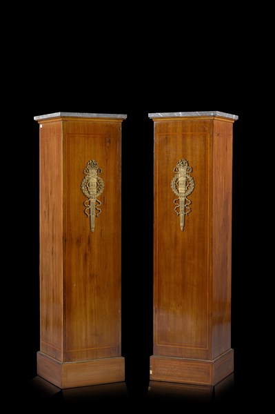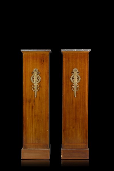 Pair of 19th-century veenered and threaded plinhts with gilt metal inserts. Marble tops (cm 127,5x34x34) (defects and restorations)