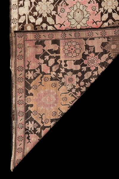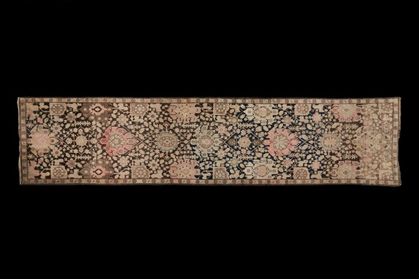 Tappeto passatoia Karabagh, Caucaso, fine secolo XIX. Decoro con piccoli medaglioni di ispirazione araldica nei toni del rosa, beige e nocciola su fondo alternato blu e marrone. Campo decorato da rami fogliacei stilizzati. Piccola bordura con rose stellate (cm 500x114) (difetti, rapature e vecchi restauri)