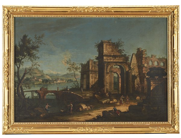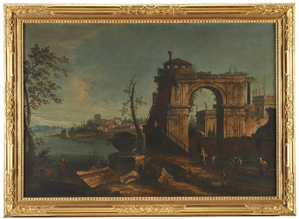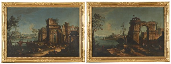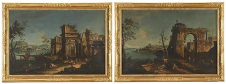 Scuola veneta del secolo XVIII Capricci con architetture e figure Coppia di di