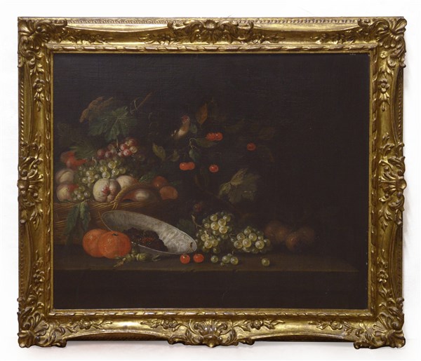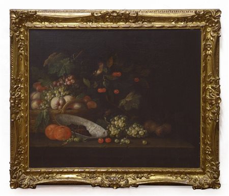 Scuola del secolo XVII Composizione con cesto di frutta, volatile e piatto Oli