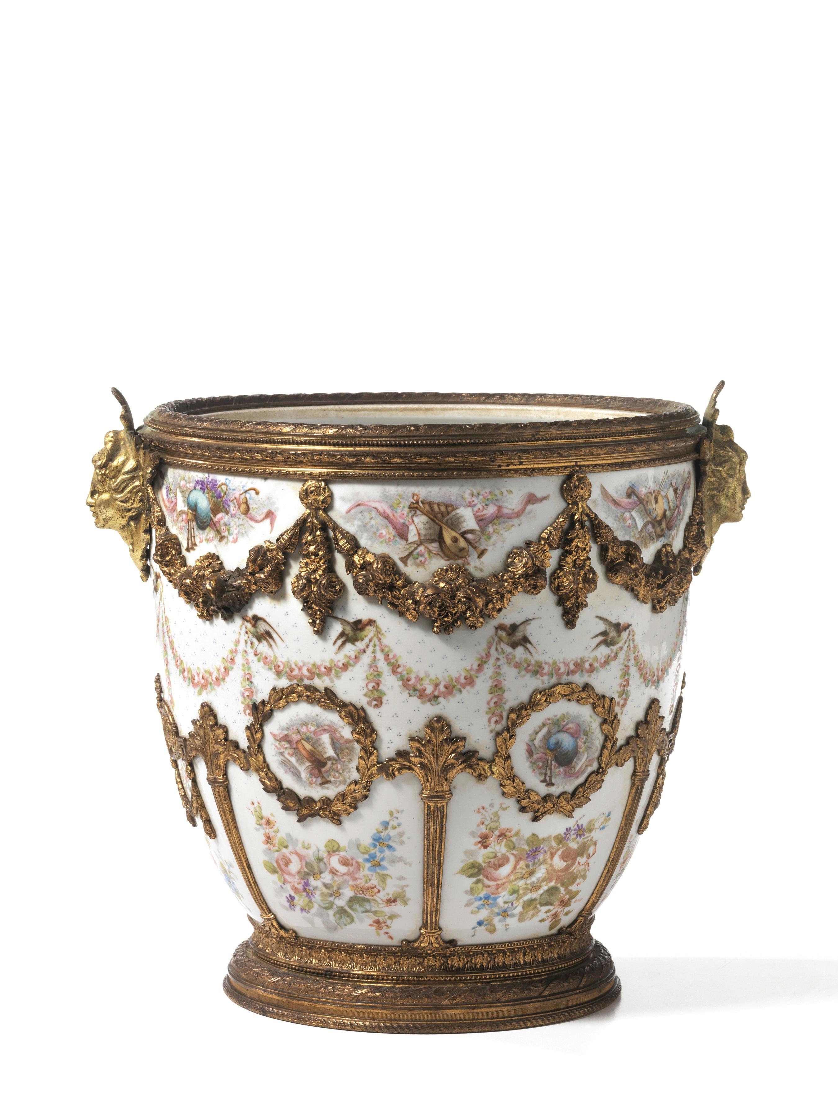 Cachepot, Francia, fine sec. XIX, in porcellana decorata a festoni, volatili e strumenti musicali, applicazioni in bronzo dorato, diam. cm 29, alt. cm 30