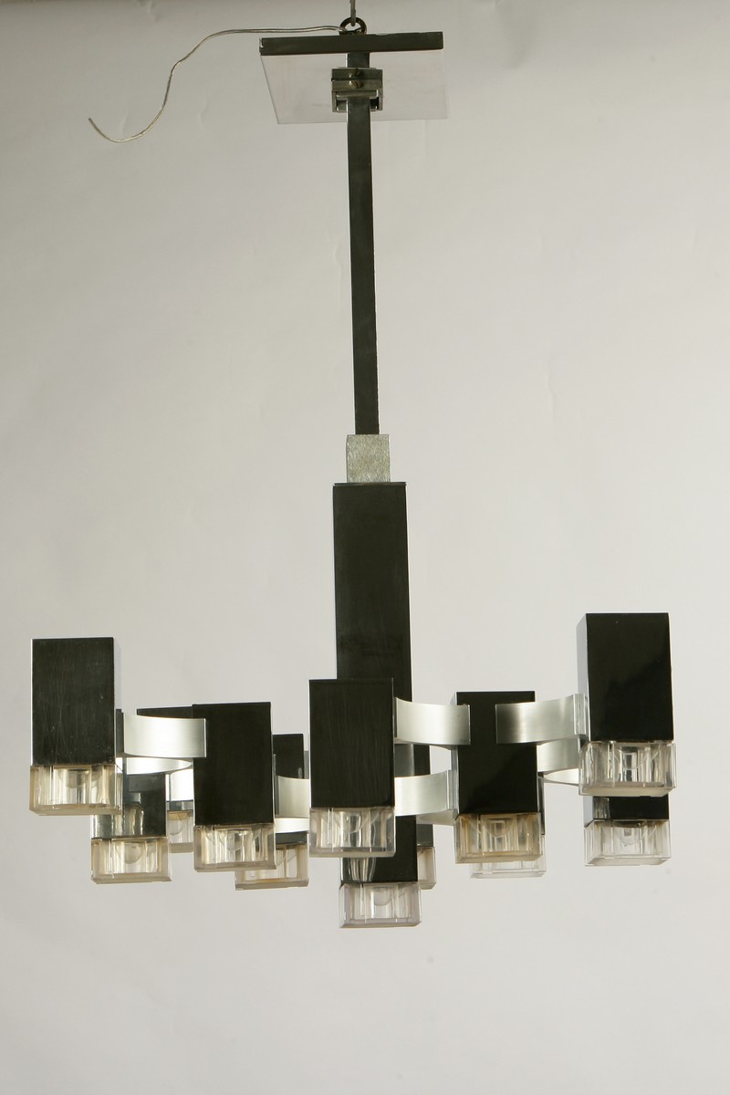SCIOLARI GAETANO. Lampadario Cubic,struttura in metallo cromato e satinato, diffusori in plexiglass trasparente. Cubic lamp,chromed and brushed metal,light source in transparent plexiglass. Metallo cromato. Cm 45x75x45. 1965.