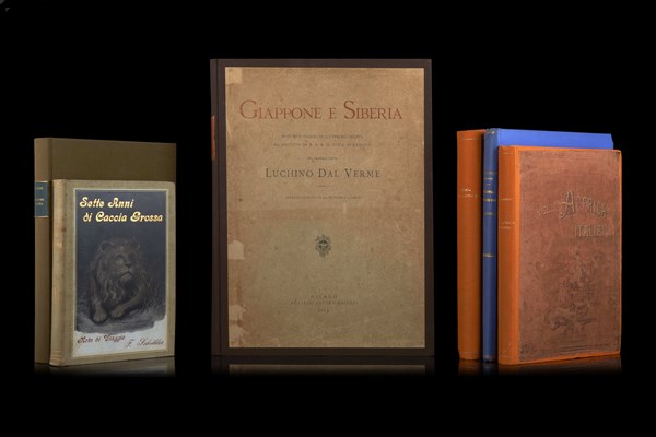 [CACCIA] Lotto di 6 volumi del tardo XIX inizi XX secolo dedicati alla caccia. SI SEGNALA: BOTTEGO. L'Esplorazione del Giuba. Roma: Voghera, 1900. 4to, una carta geografica ripiegata, diverse illustrazioni e tavole. Legatura moderna in tela verde [CON:] MARTINI, Ferdinando. Nell' Affrica Italiana. Milano: Treves, 1896. 4to, 2 carte geografiche e diverse tavole e illustrazioni. Legatura moderna in tela che conserva parte dell'originale in percallina [CON:] SCHEIBLER, Felice. Sette Anni Di Caccia Grossa E Note Di Viaggio in America, Asia, Africa, Europa. Milano: Hoepli, 1910. 8vo, numerose illustrazioni fotografiche nel testo. Legatura editoriale in percallina decorata. [CON] DAL VERME Luchino. Giappone e Siberia. Note d'un viaggio nell'estremo oriente al seguito di S.A.R. il Duca di Genova: Treves, 1905. Folio,numerose tavole, mappe e illustrazioni. Legatura moderna in mezza tela che recupera il cartonato editoriale originale. Seconda edizione di questo affascinante resoconto di una delle prime spedizioni moderne italiane in estremo oriente (difetti)